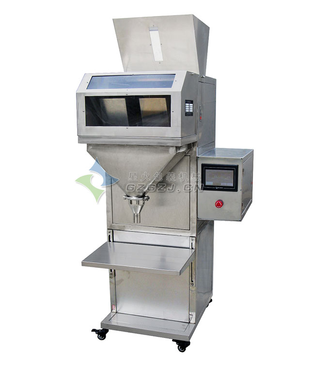 2.雙斗單稱顆粒定量包裝機采用雙振動斗給料,單稱重斗稱重,速度快。